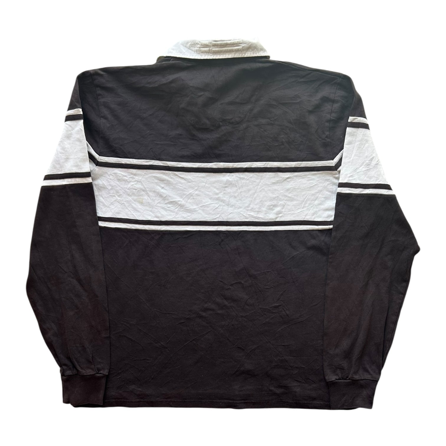 Product details: Brown rugby shirt with horizontal white stripe and white embroidery