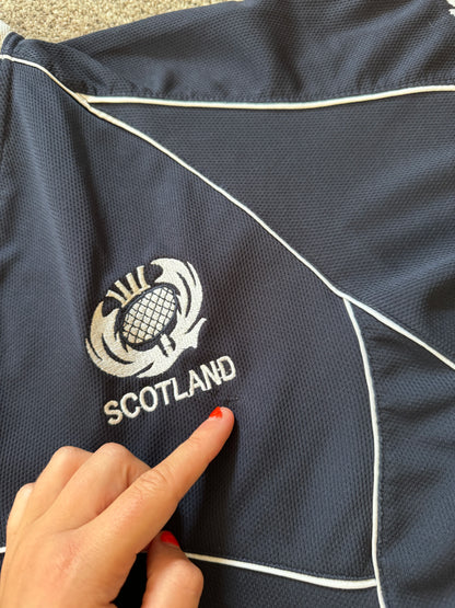 Product details: Contrast white piping, embroidered Scotland crest, classic rugby collar, large SCOTLAND lettering on reverse, flag detail on back.