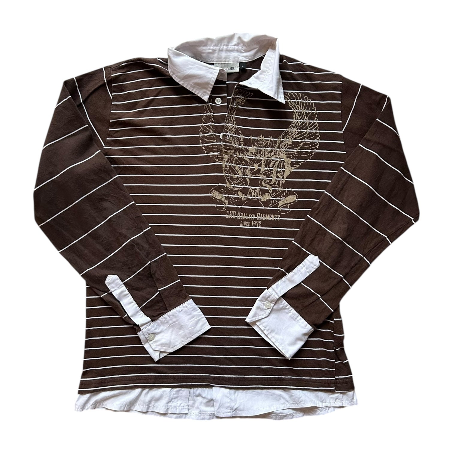 Product details: Brown and white striped rugby shirt, with gold graphic across the front.
