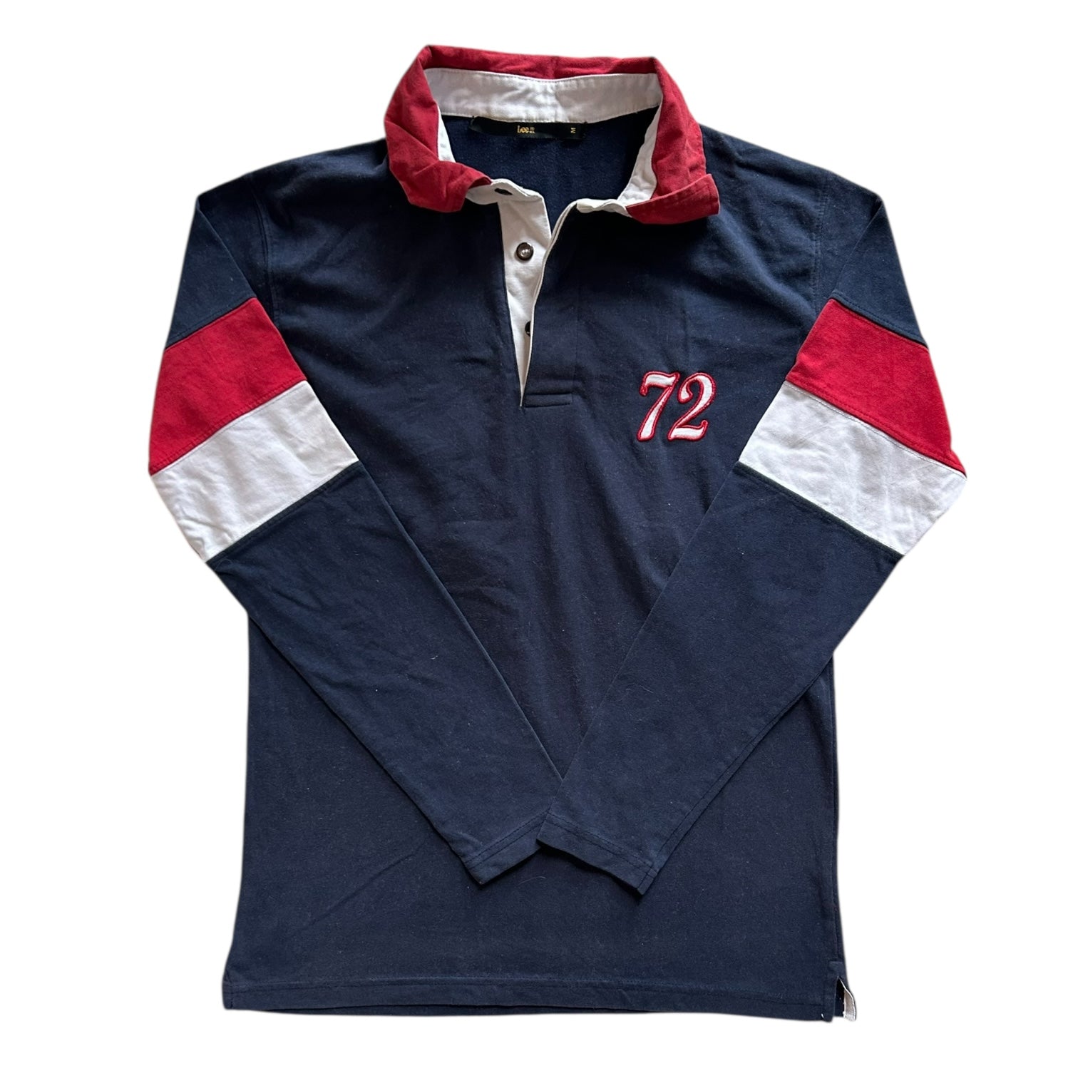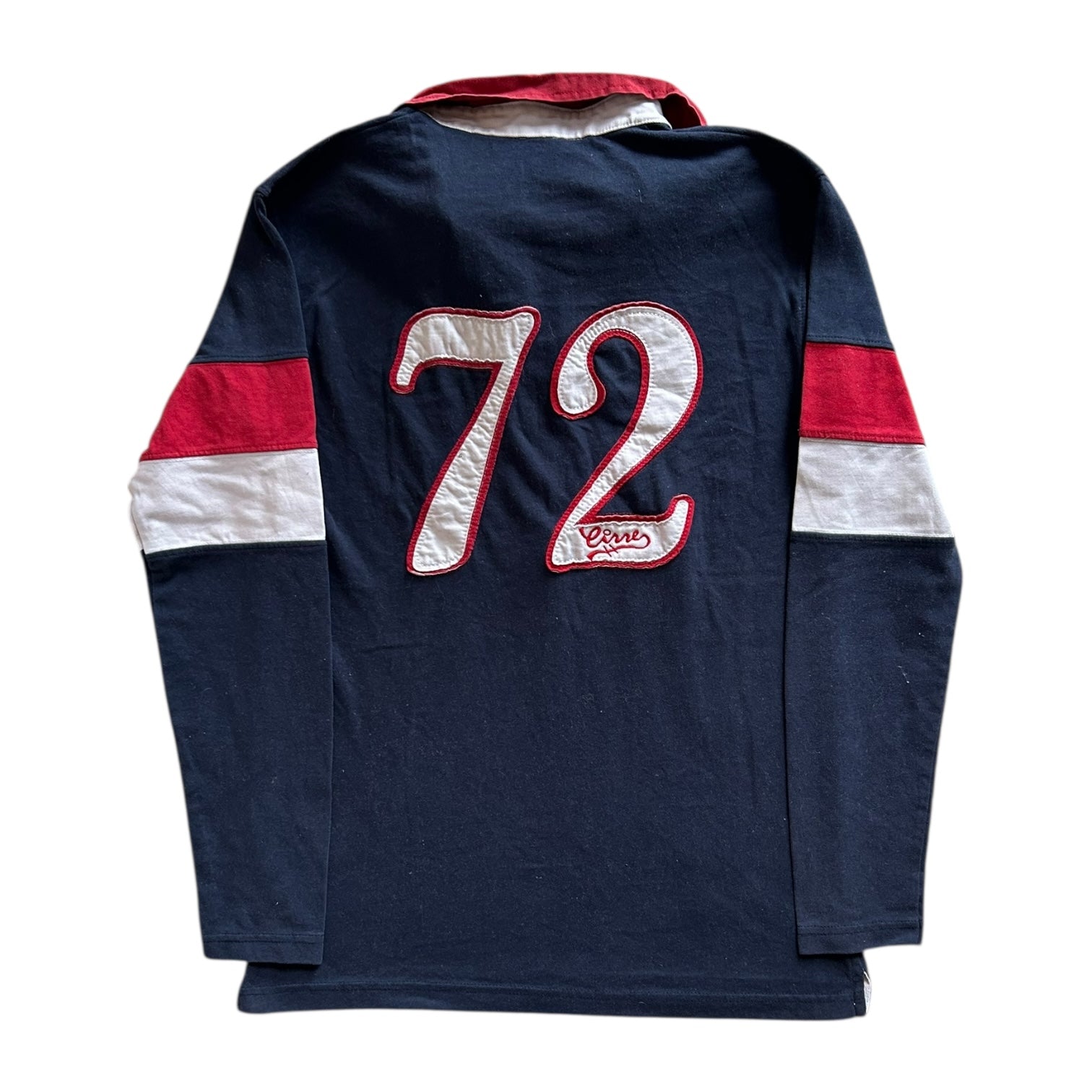 Product details: Navy rugby shirt with red and white stripe on the sleeves, '72' text on the front and back.